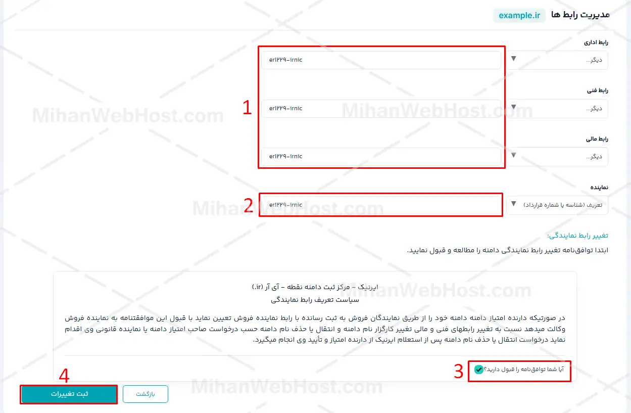 همچنین در بخش نماینده، گزینه "تعریف (شناسه یا شماره قرارداد)" را انتخاب کنید. در نهایت شناسه "er1229-irnic" را در فیلد مشخص شده قرار دهید (شماره2)، قوانین را پذیرفته (شماره 3) و گزینه "ثبت تغییرات" را انتخاب نمایید (شماره 4).