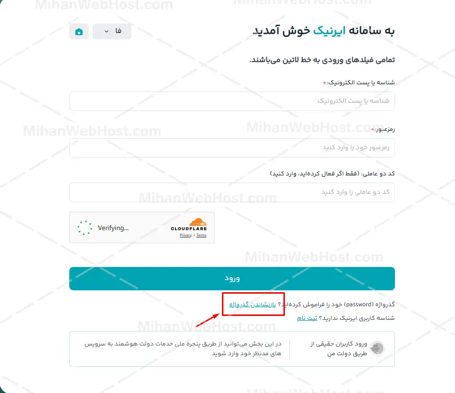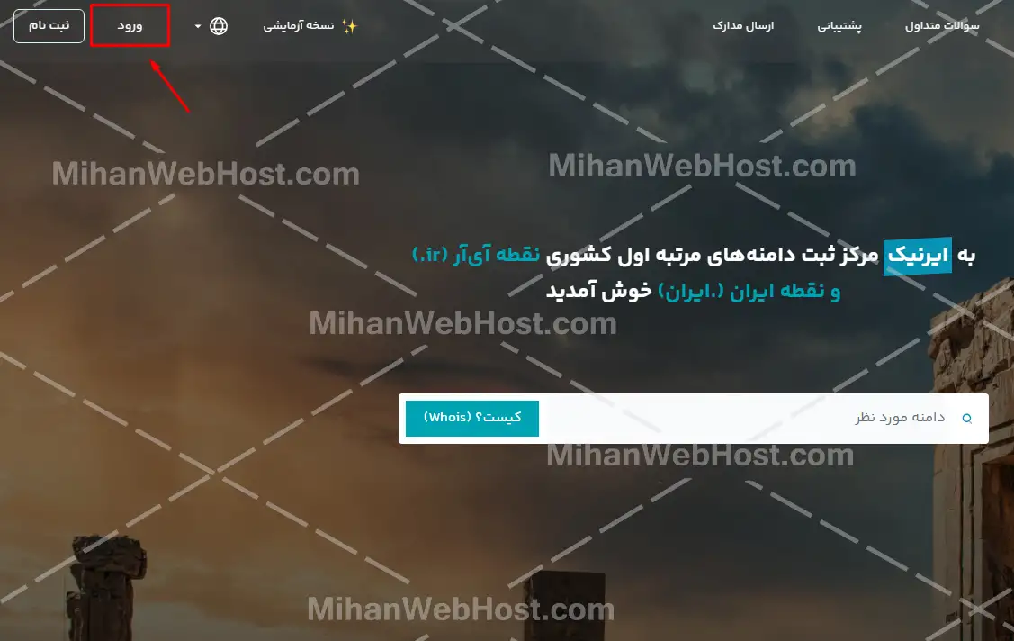 چنانچه رمز عبور خود را فراموش کرده اید، می توانید وارد سایت ایرنیک شده و مطابق با تصویر زیر روی گزینه "ورود" کلیک نمایید.