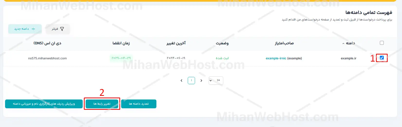 پس از ورود به صورت خودکار به صفحه "دامنه های من" منتقل میشوید. در این بخش میبایست دامنه موردنظر را انتخاب (شماره1) و سپس روی "تغییر رابط ها" (شماره2) کلیک نمایید.