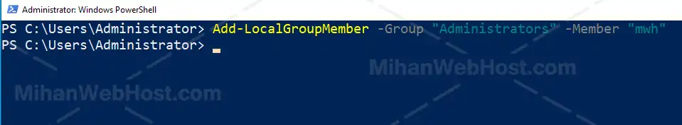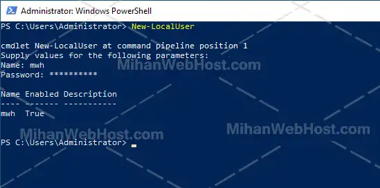 بعد از اجرای دستور، پاورشل از شما درخواست میکند نام کاربری را وارد نمایید. پس از تایپ نام کاربر، کلید Enter را بزنید. در مرحله بعد، رمز عبور مورد نظر را وارد کرده و دوباره کلید Enter را فشار دهید تا یوزر ساخته شود.