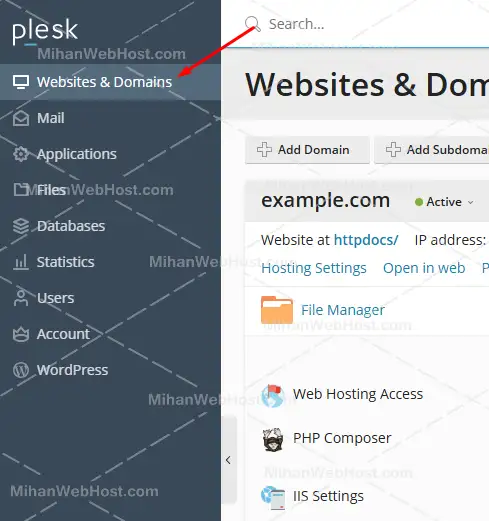 ابزار Logs در کنترل پنل پلسک به شما امکان می دهد فعالیت های وب سایت خود را به صورت زنده مشاهده کرده تا خطاها، درخواست ها و رویدادهای مهم را بتوانید بررسی کنید. برای استفاده از این ابزار ابتدا وارد کنترل پنل Plesk شوید. از منوی سمت چپ روی "Websites & Domains" کلیک کنید.